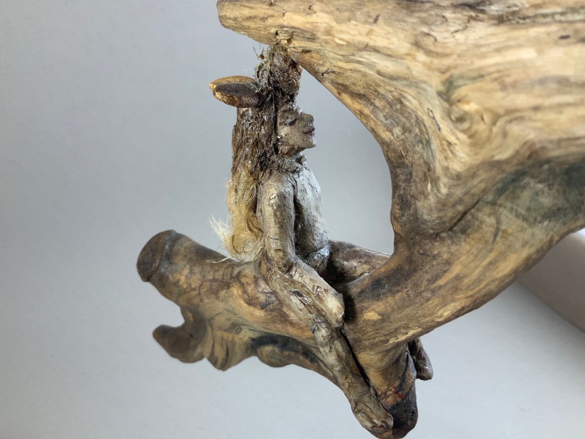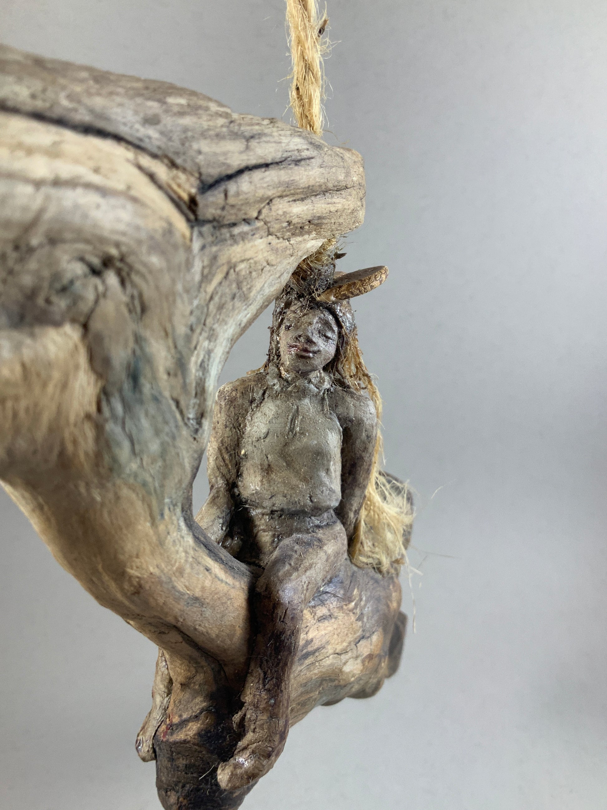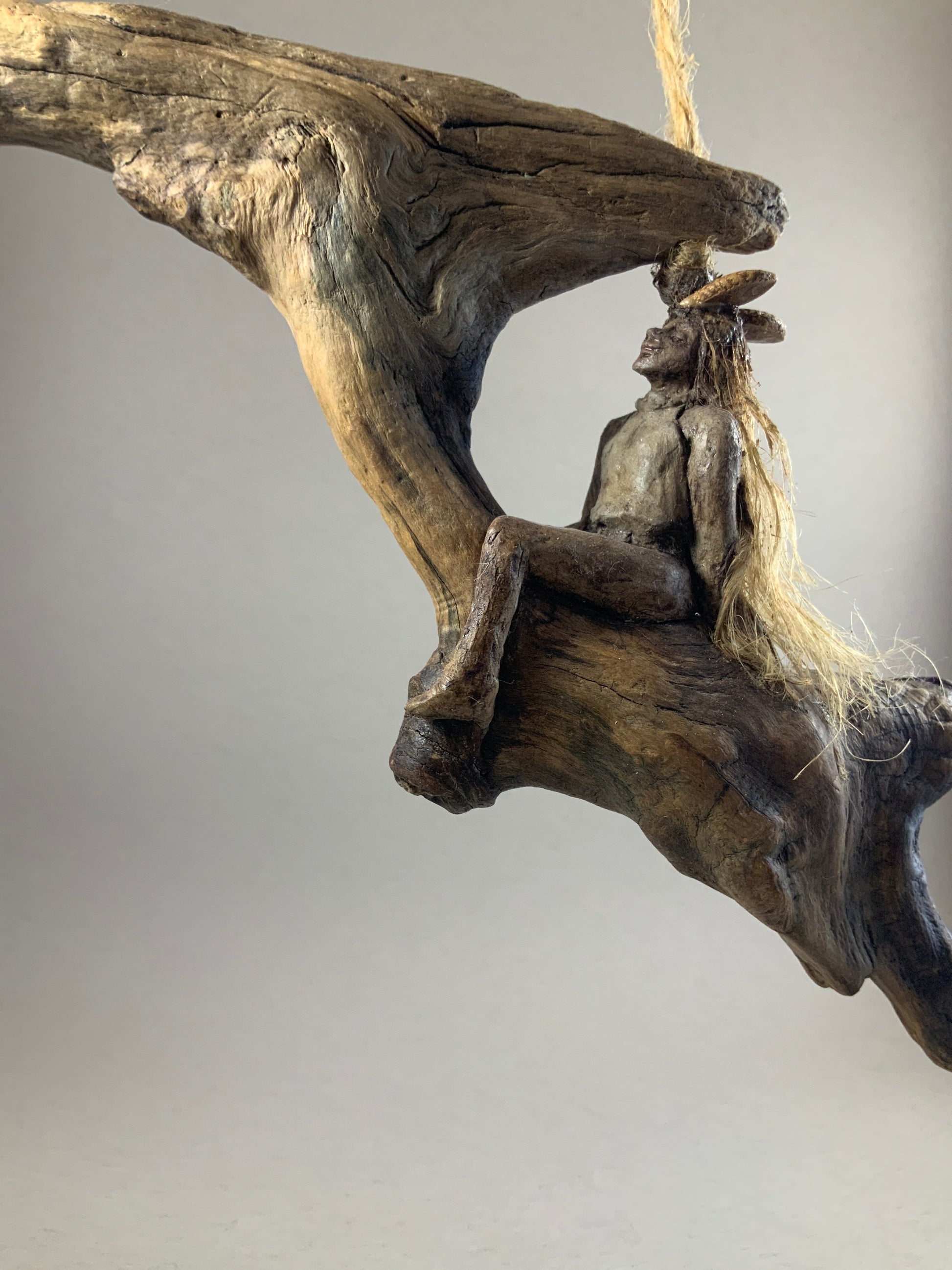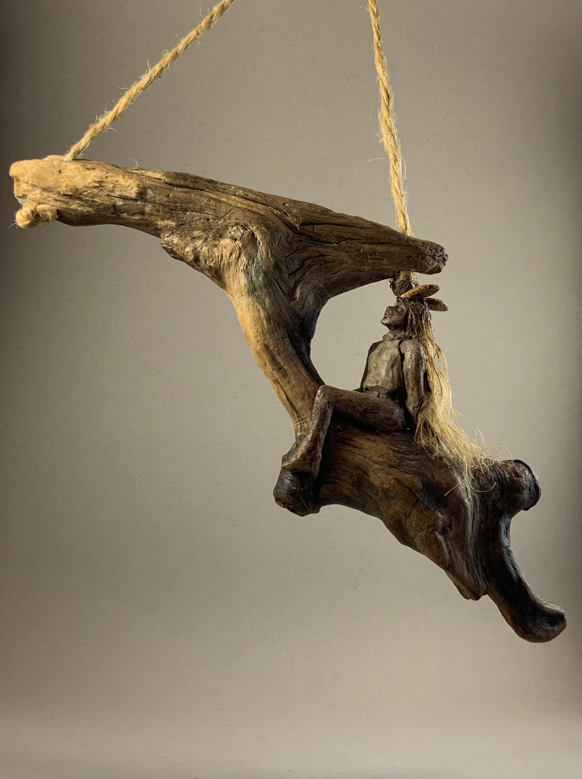Cette œuvre unique, de l’artiste Claudie Villeneuve, est issue de la série Les Symbiotes et représente des fées célestes, marines et forestières, façonnées dans la terre/papier et reliées à leur essence boisée, ont des matières organiques et des valeurs écologiques. Un être fusionné avec la nature. Le personnage semble fusionner avec les éléments, comme s’il était issu de la même matière. Ce mobile, créé en 2021 est recouvert d’une patine à l’huile.