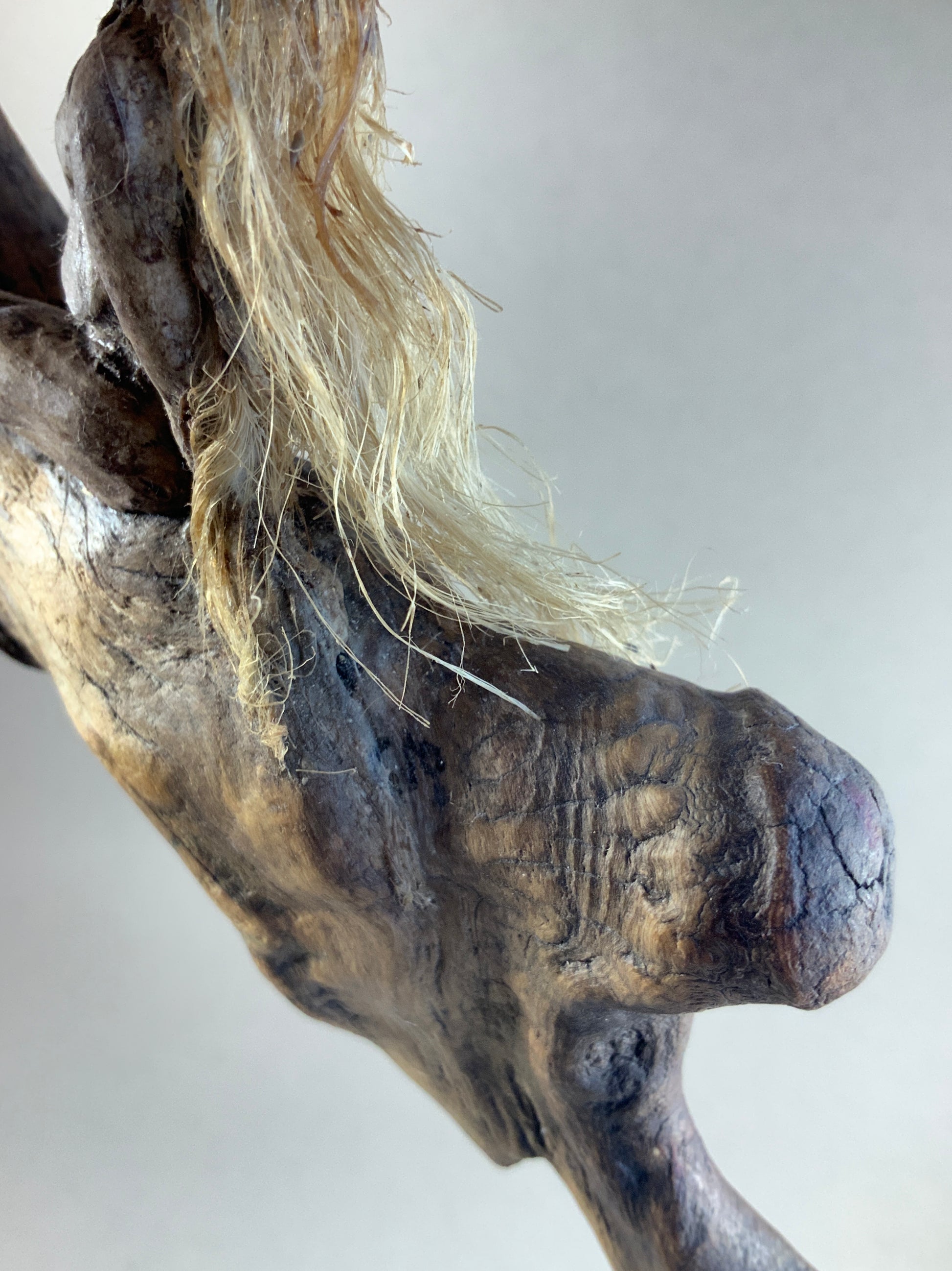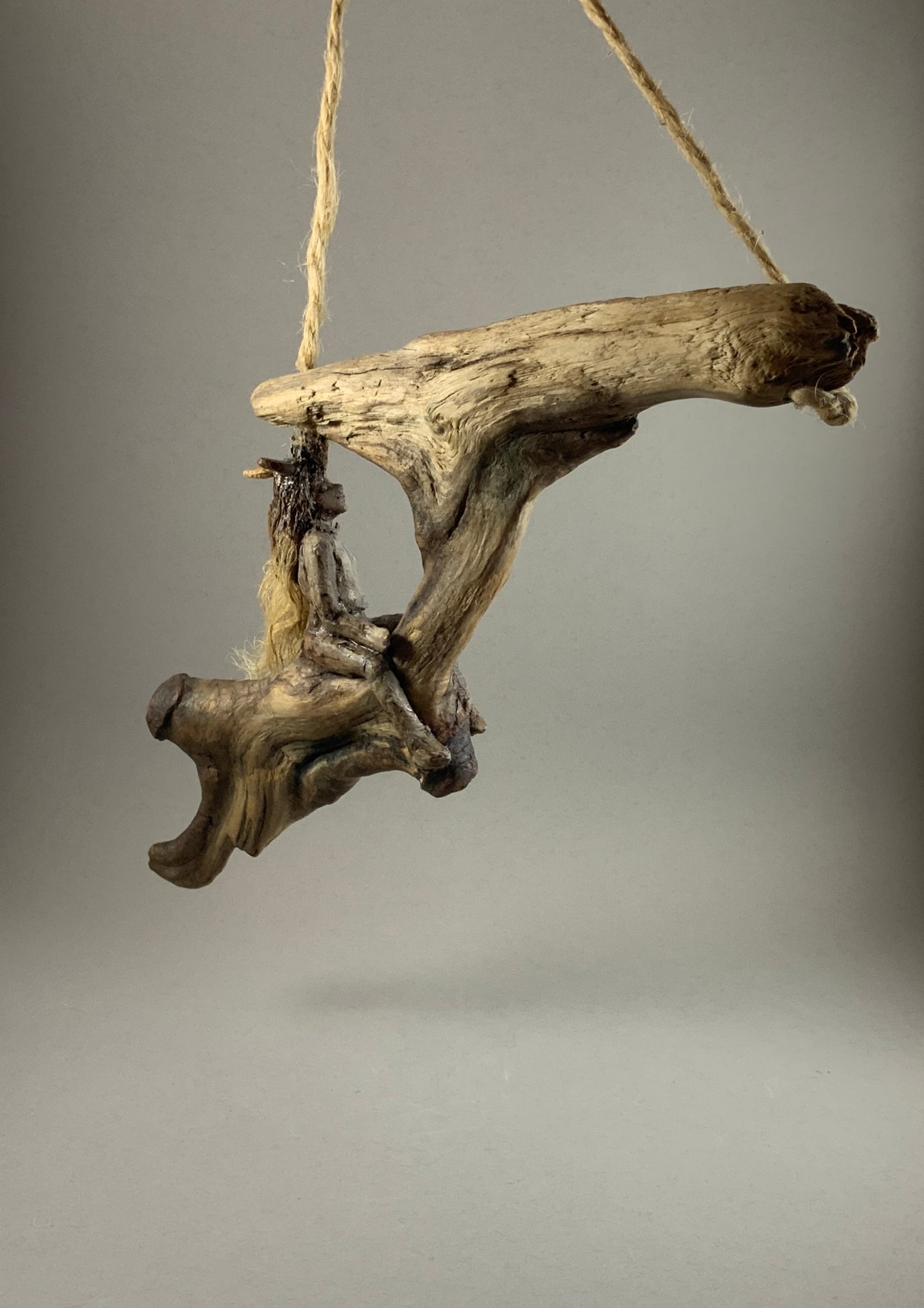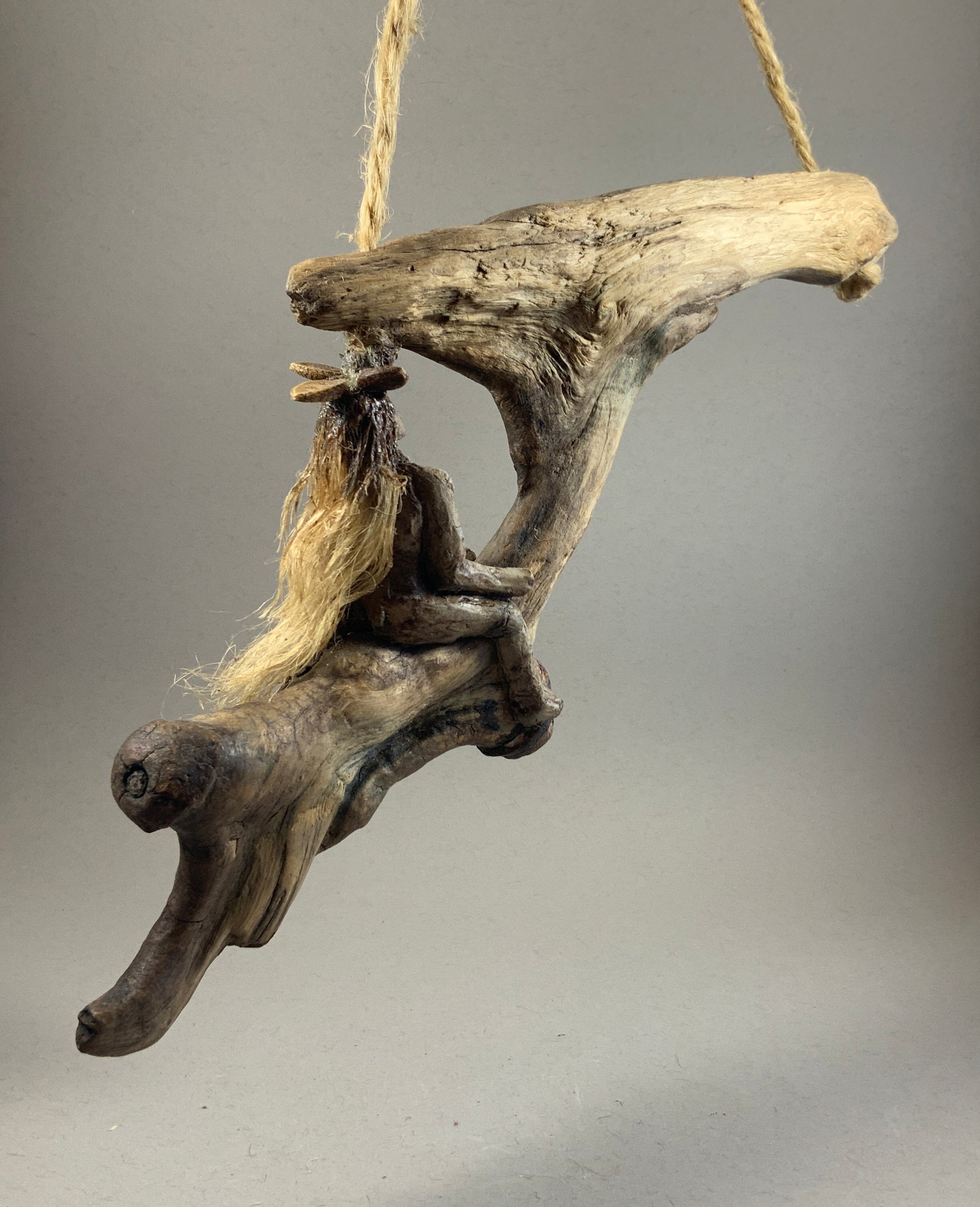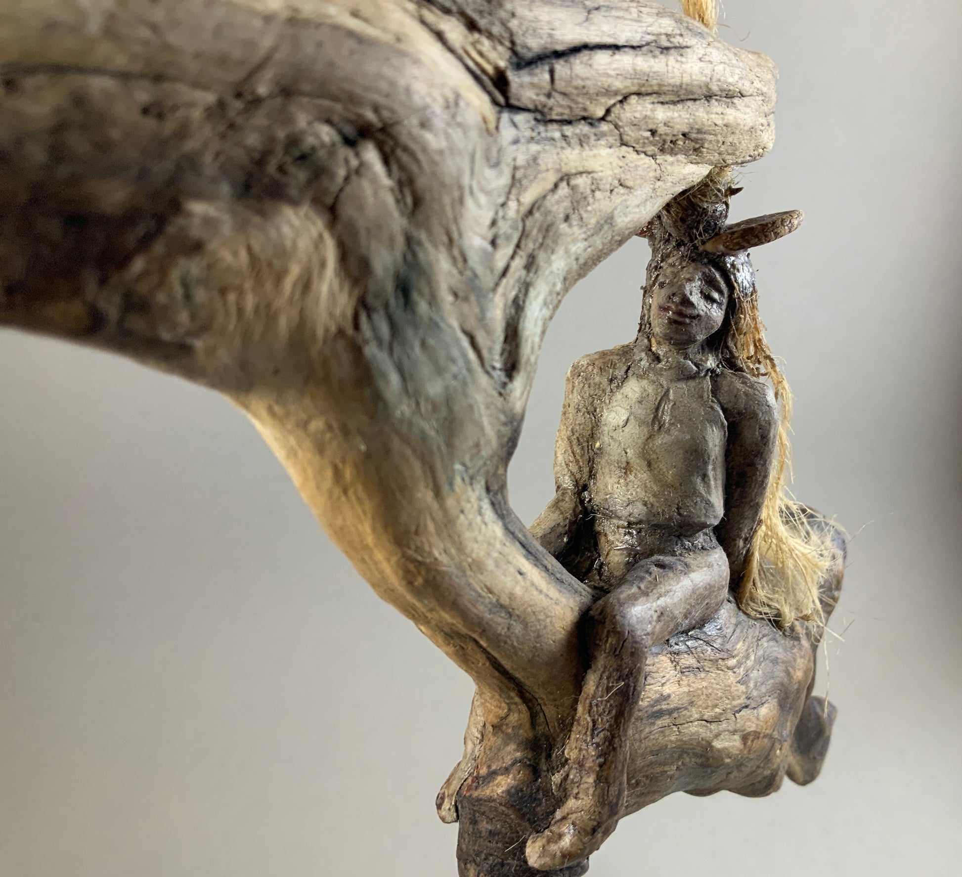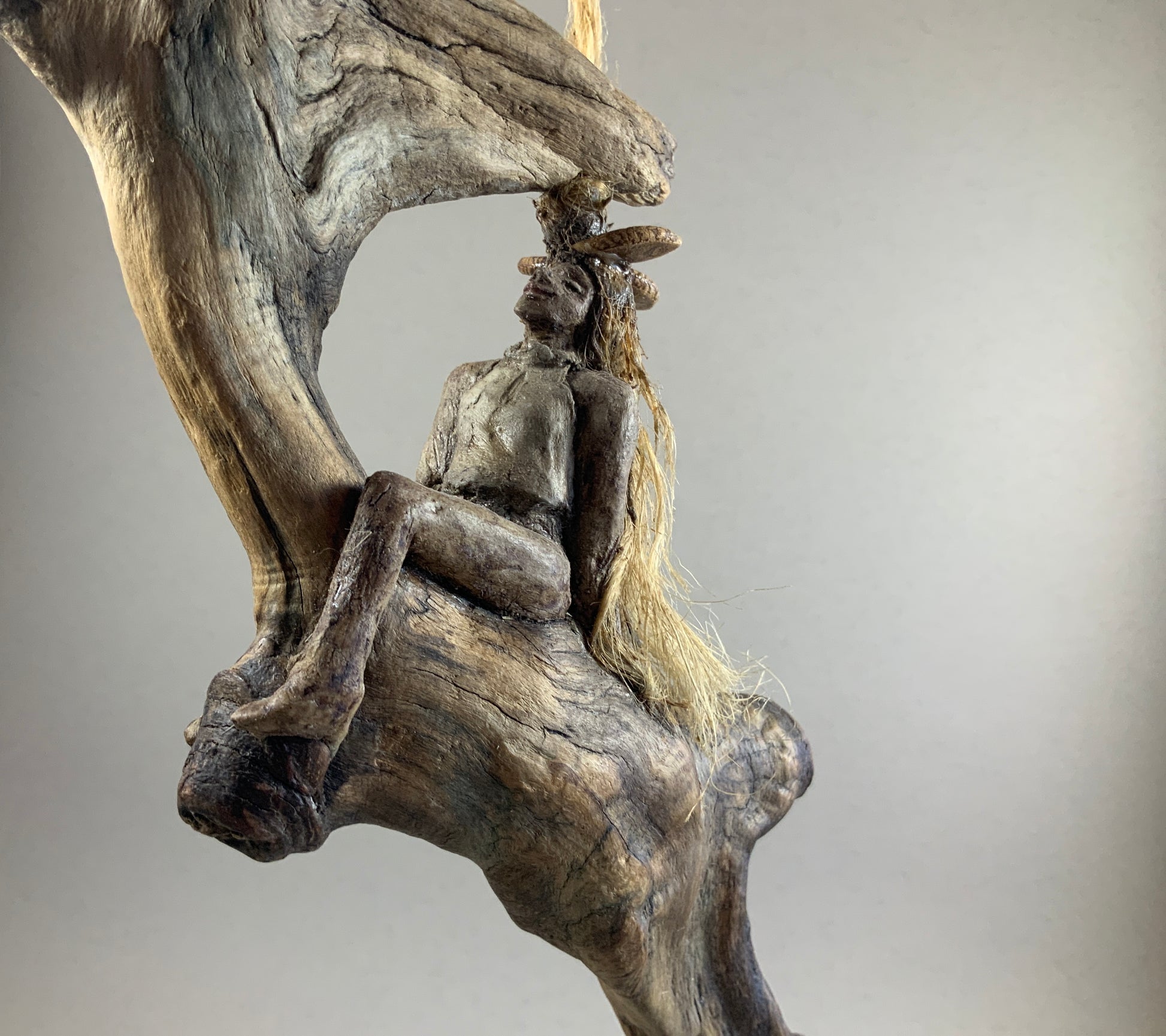Cette œuvre unique, de l’artiste Claudie Villeneuve, est issue de la série Les Symbiotes et représente des fées célestes, marines et forestières, façonnées dans la terre/papier et reliées à leur essence boisée, ont des matières organiques et des valeurs écologiques. Un être fusionné avec la nature. Le personnage semble fusionner avec les éléments, comme s’il était issu de la même matière. Ce mobile, créé en 2021 est recouvert d’une patine à l’huile.
