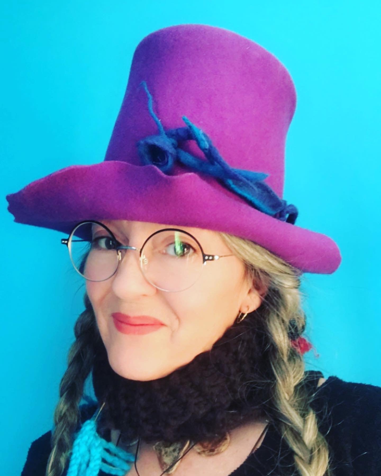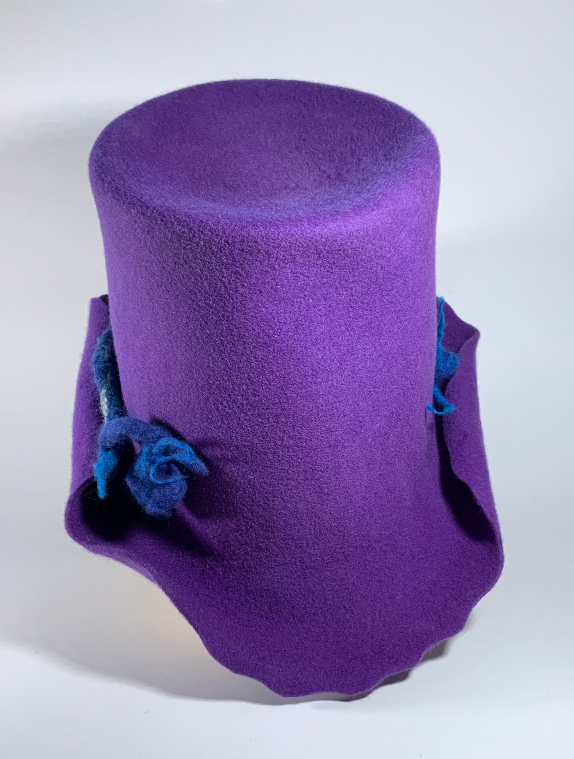 Chapeau de feutre haute forme violet, très épais, convient à un tour de tête de 23 1/2 pouces, peut s’ajuster pour 22 1/2 pouces, avec des formes feutrés en accessoires décoratifs. Se porte de tous les côtés.