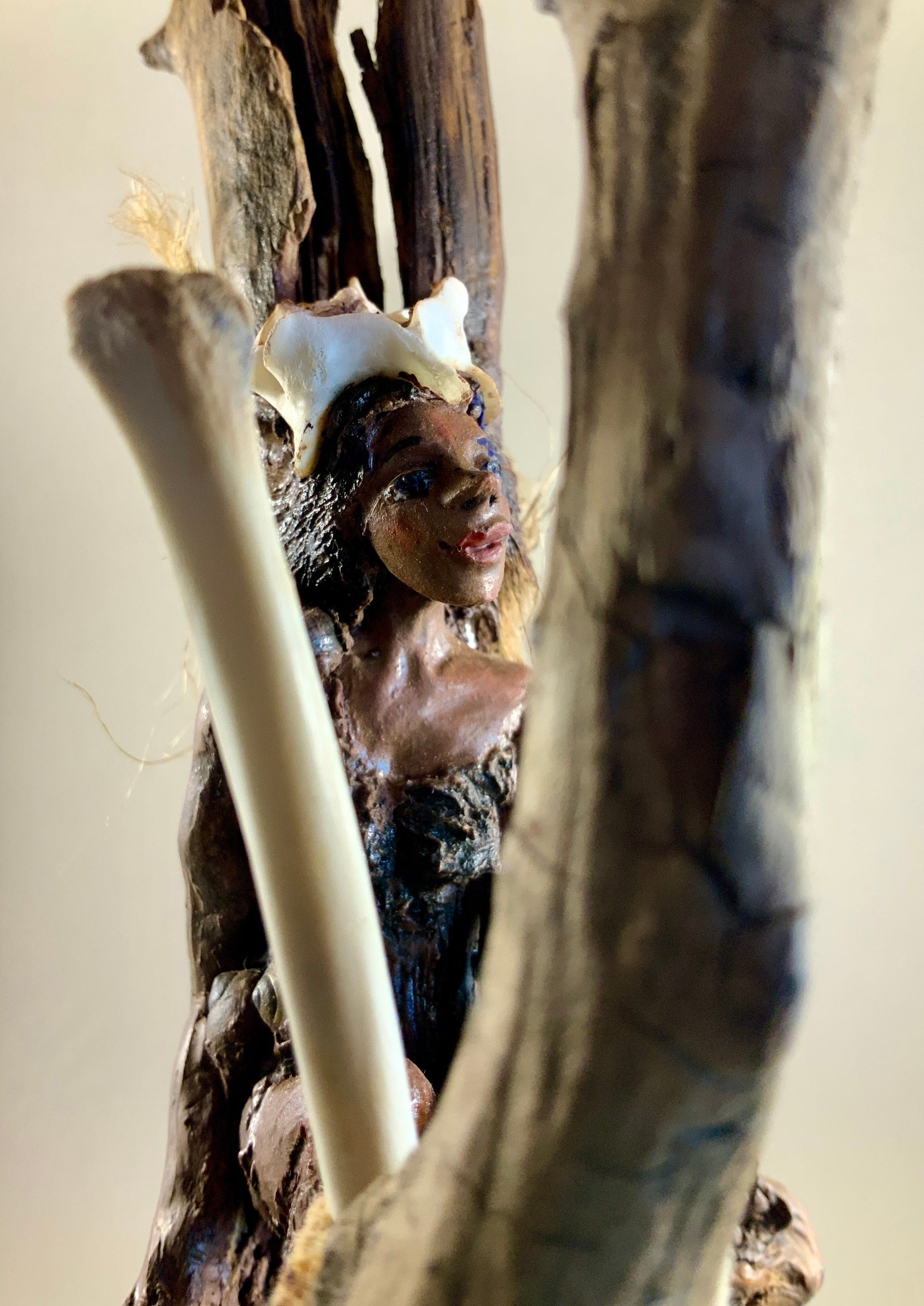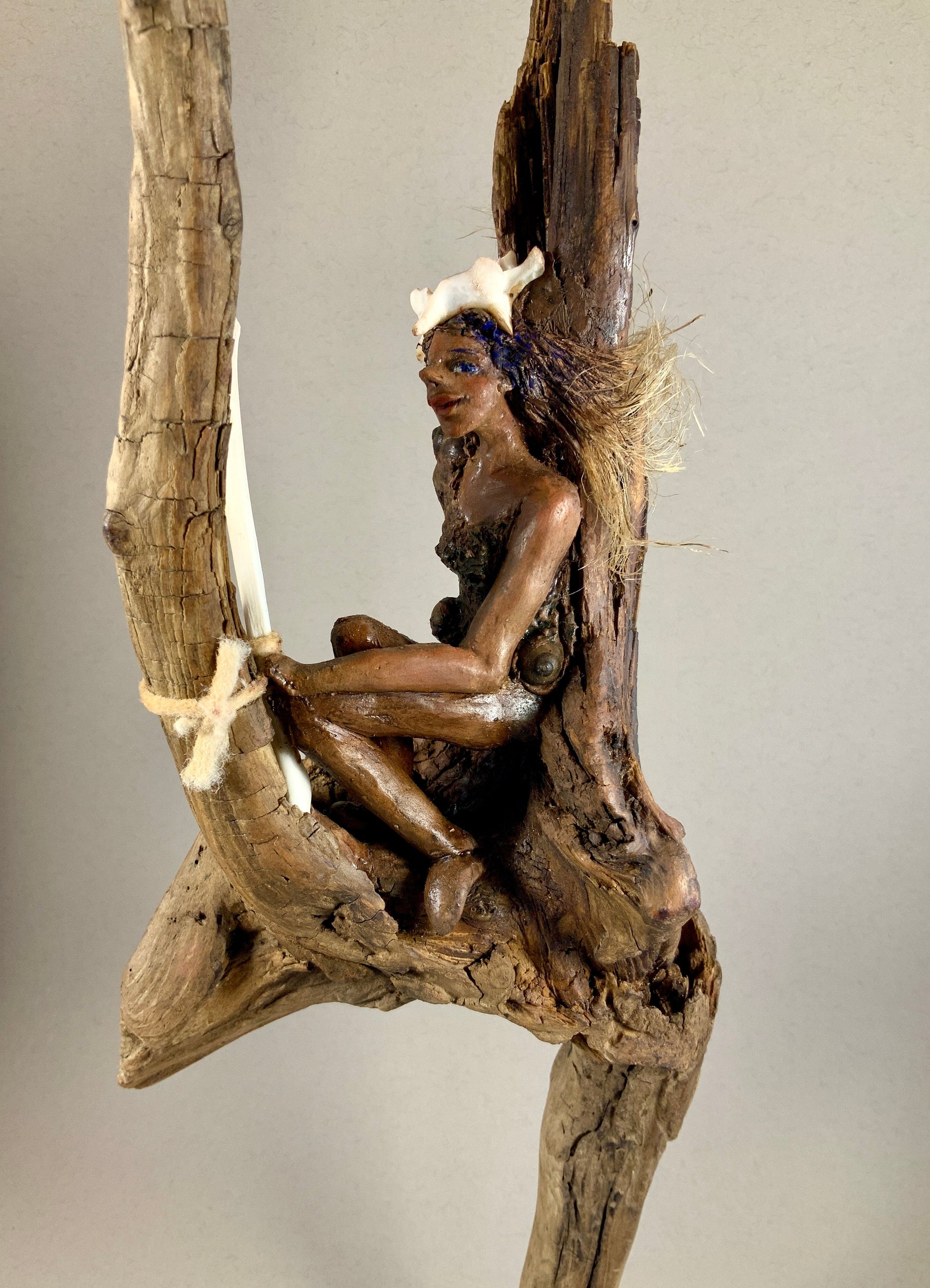 Cette œuvre unique, de l’artiste Claudie Villeneuve, est issue de la série Les Symbiotes et représente des fées célestes, marines et forestières, façonnées dans la terre/papier et reliées à leur essence boisée, ont des matières organiques et des valeurs écologiques. Un être fusionné avec la nature. Le personnage semble fusionner avec les éléments, comme s’il était issu de la même matière. Ce mobile réalisé en 2023 est recouvert d’une patine à l’huile.