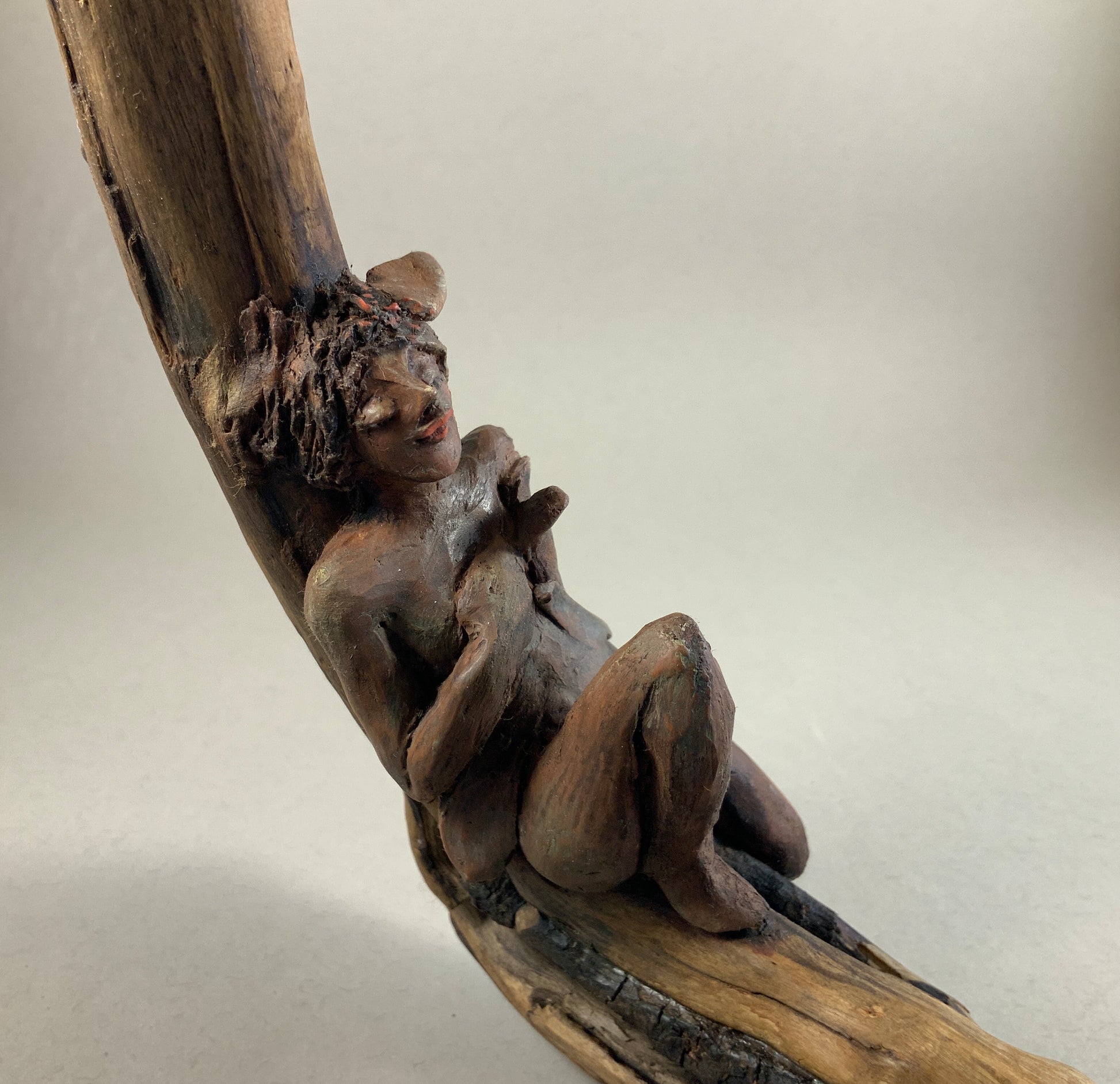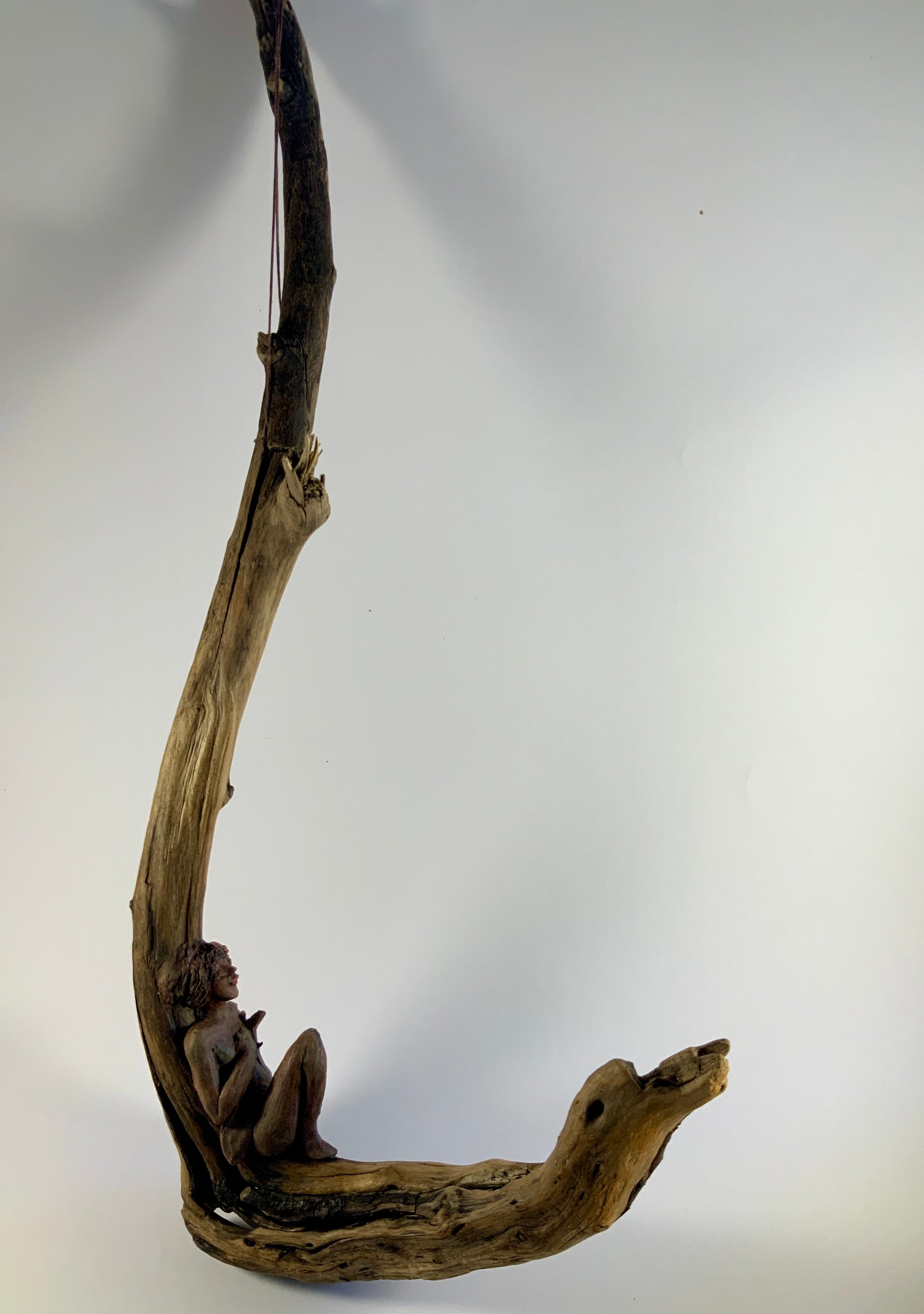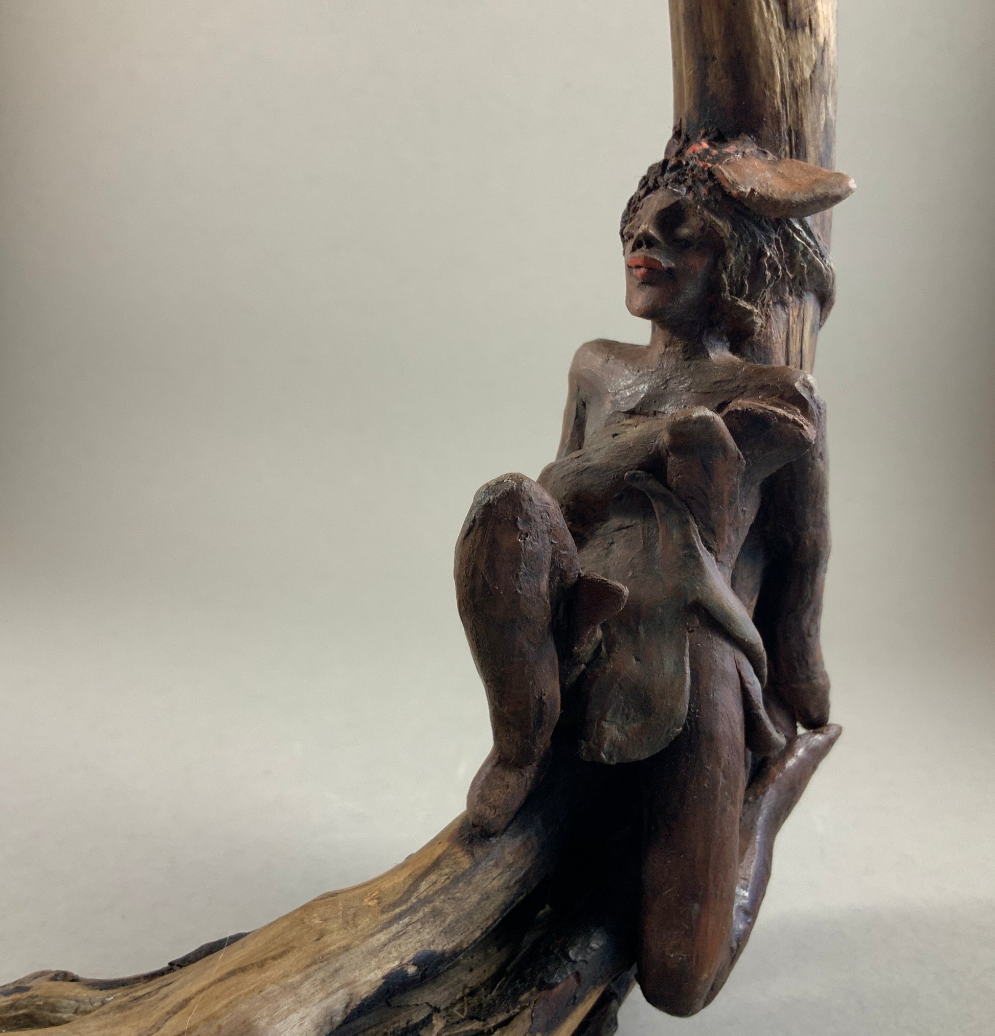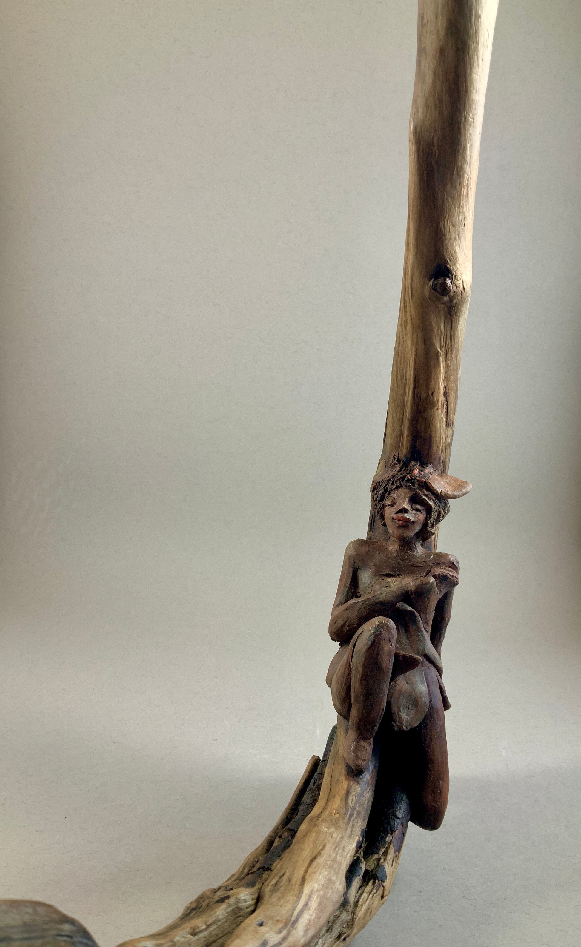 Cette œuvre unique, de l’artiste Claudie Villeneuve, est issue de la série Les Symbiotes et représente des fées célestes, marines et forestières, façonnées dans la terre/papier et reliées à leur essence boisée, ont des matières organiques et des valeurs écologiques. Un être fusionné avec la nature. Le personnage semble fusionner avec les éléments, comme s’il était issu de la même matière. Ce mobile, créé en 2021 est recouvert d’une patine à l’huile.