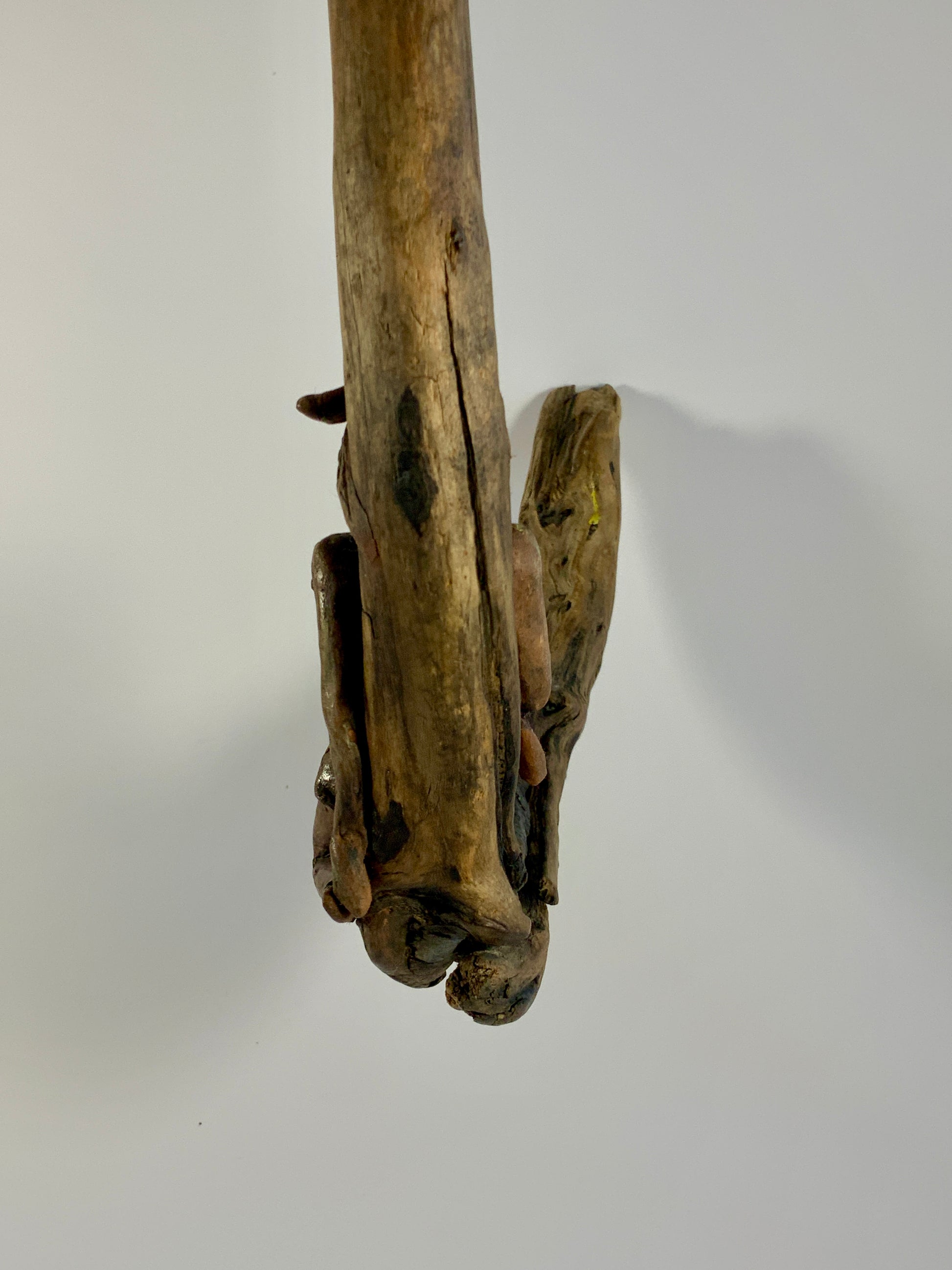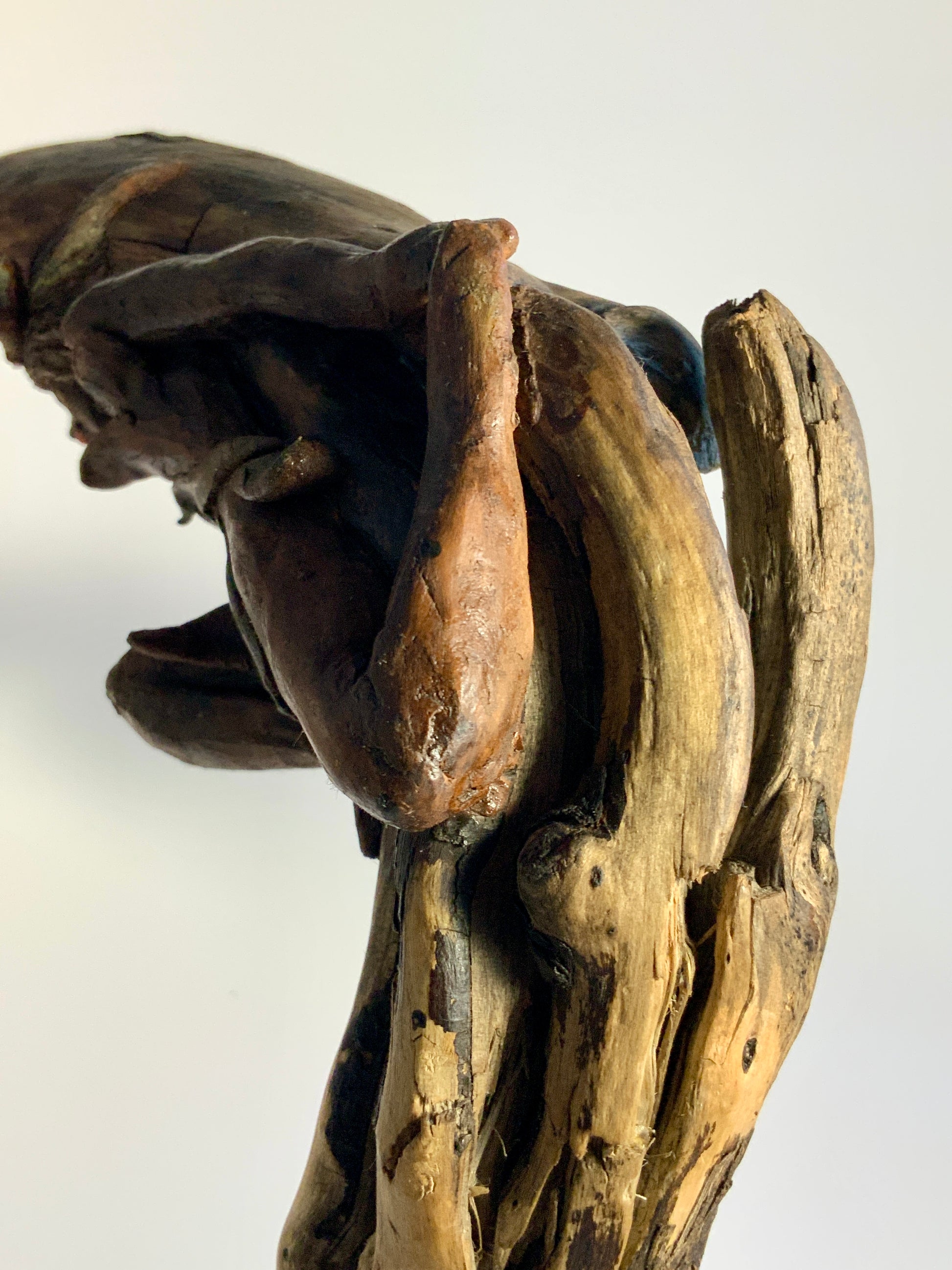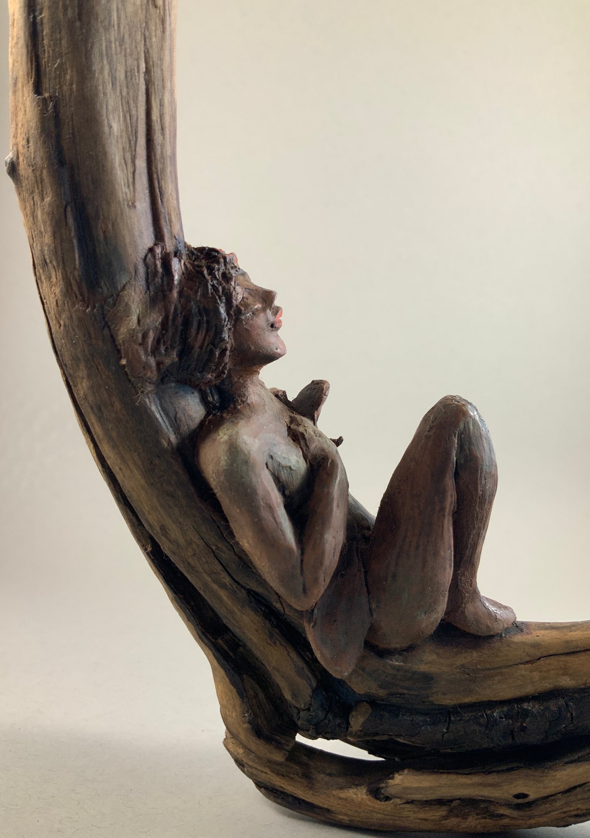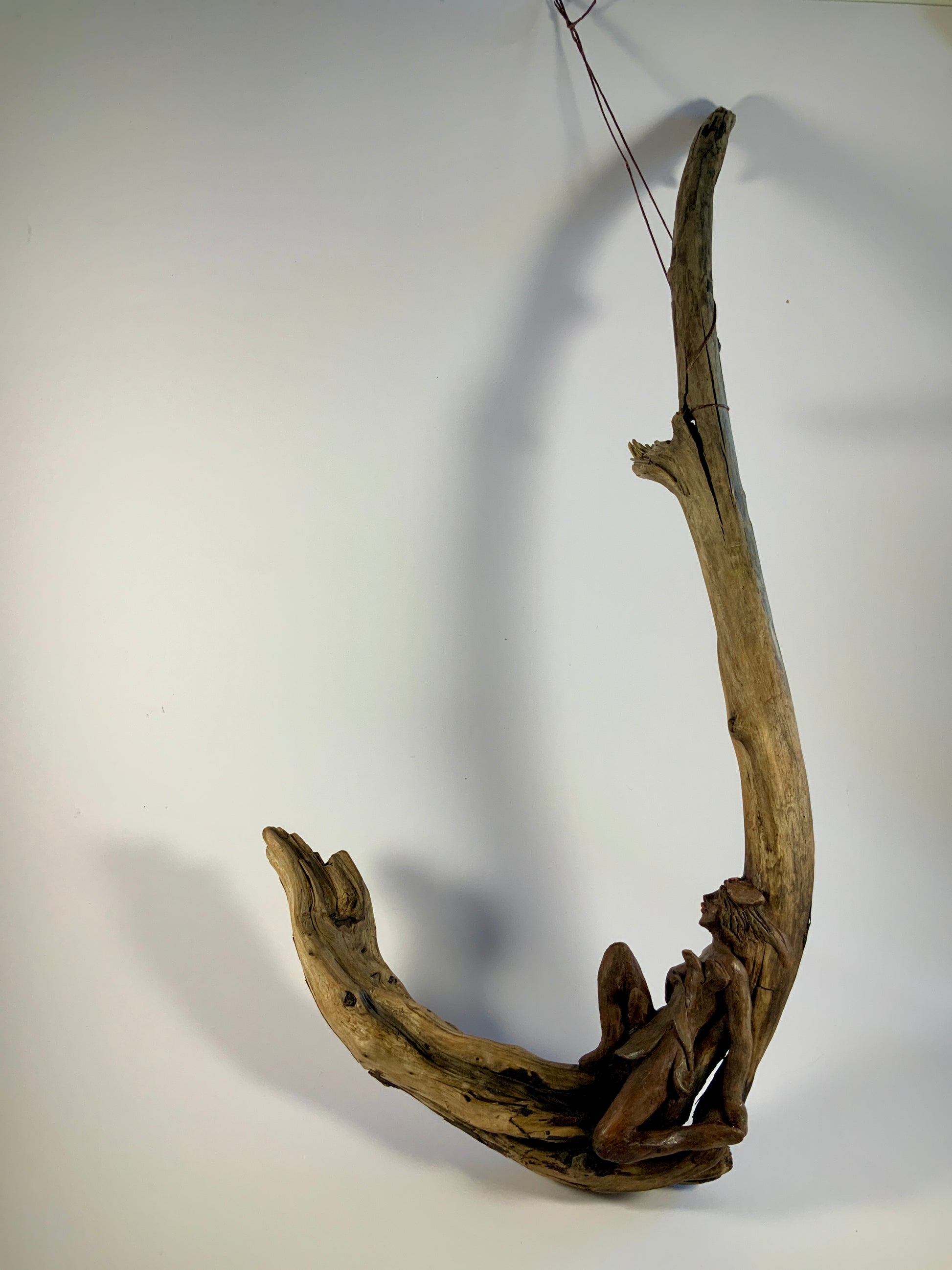 Cette œuvre unique, de l’artiste Claudie Villeneuve, est issue de la série Les Symbiotes et représente des fées célestes, marines et forestières, façonnées dans la terre/papier et reliées à leur essence boisée, ont des matières organiques et des valeurs écologiques. Un être fusionné avec la nature. Le personnage semble fusionner avec les éléments, comme s’il était issu de la même matière. Ce mobile, créé en 2021 est recouvert d’une patine à l’huile.