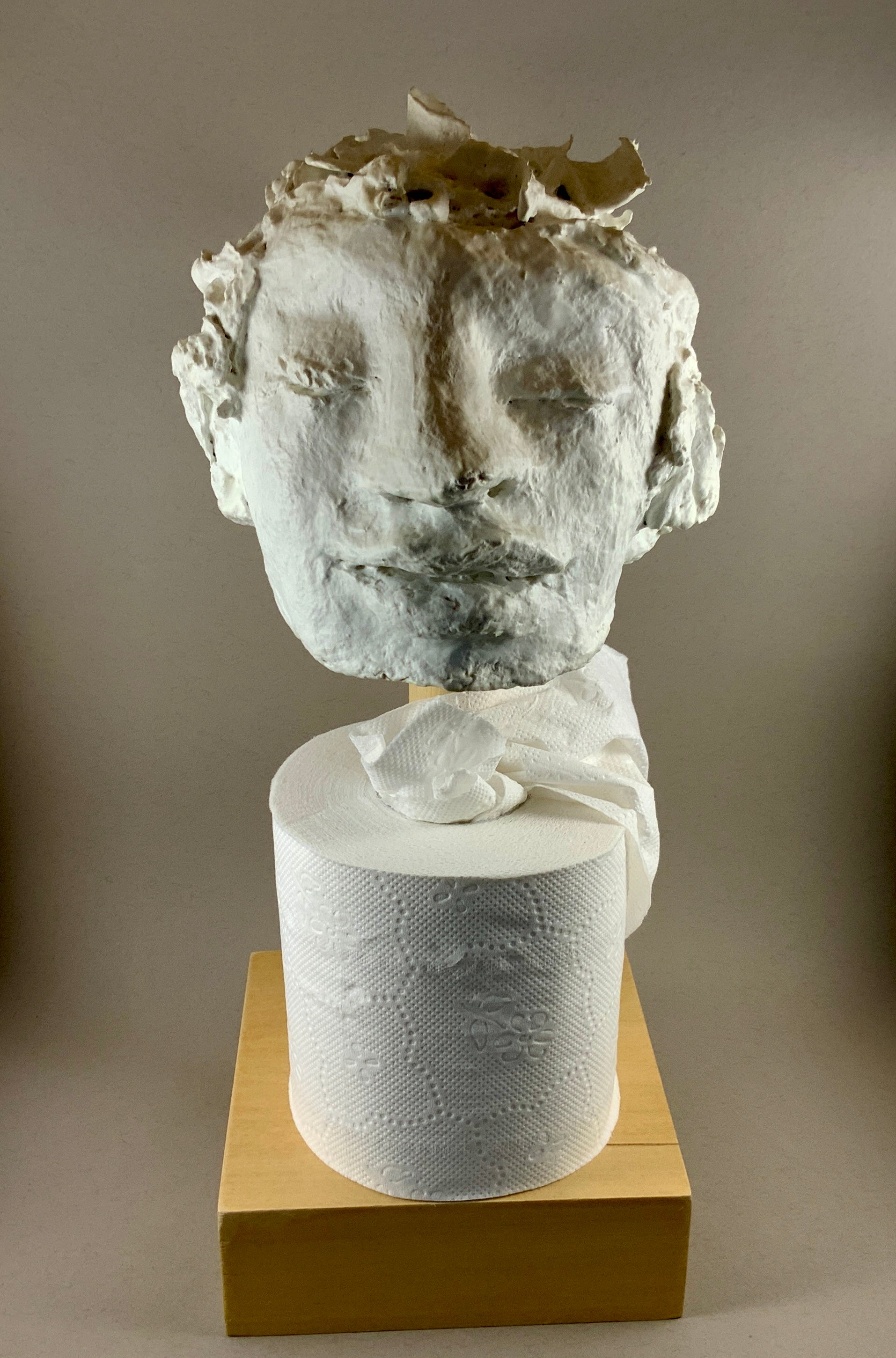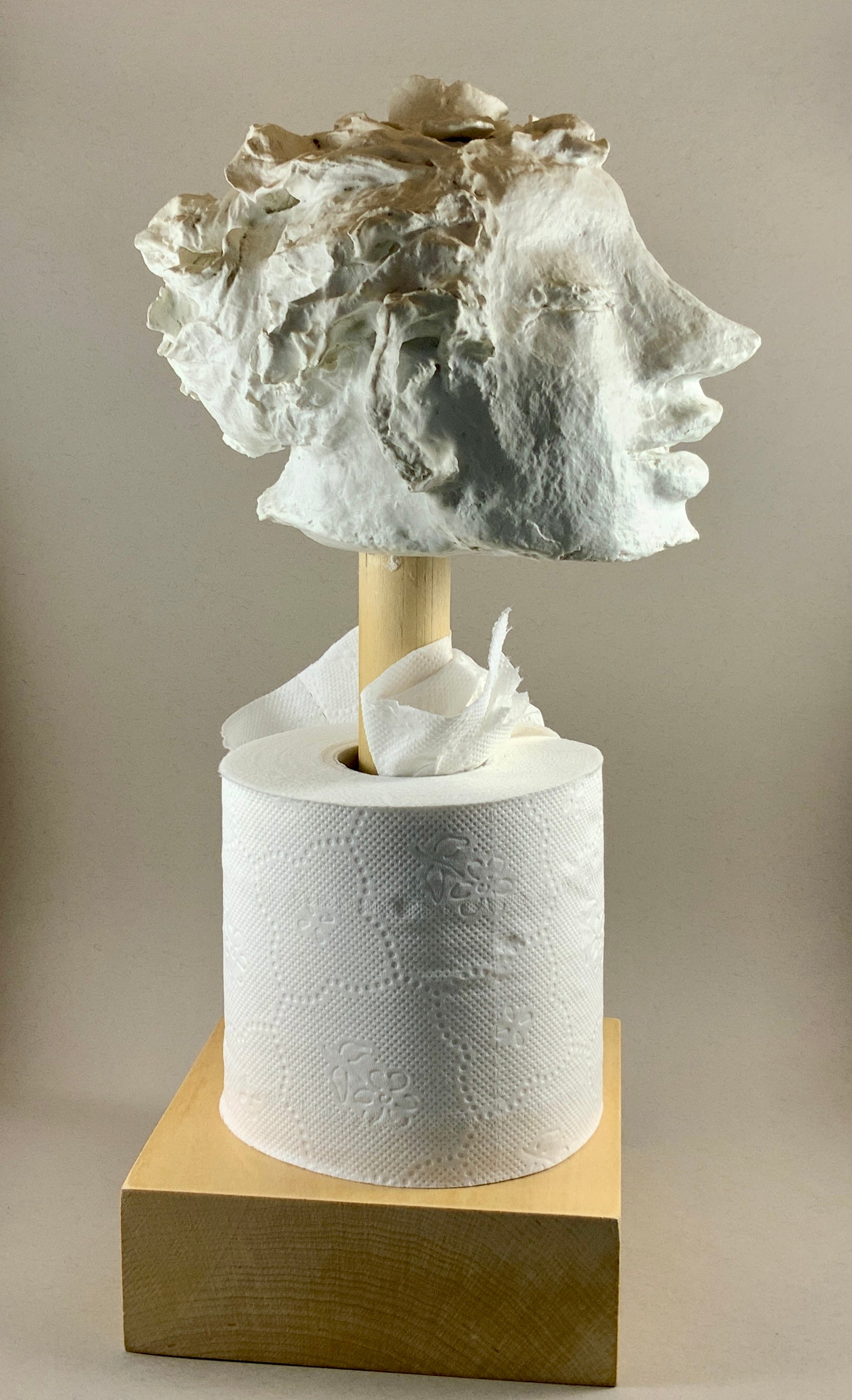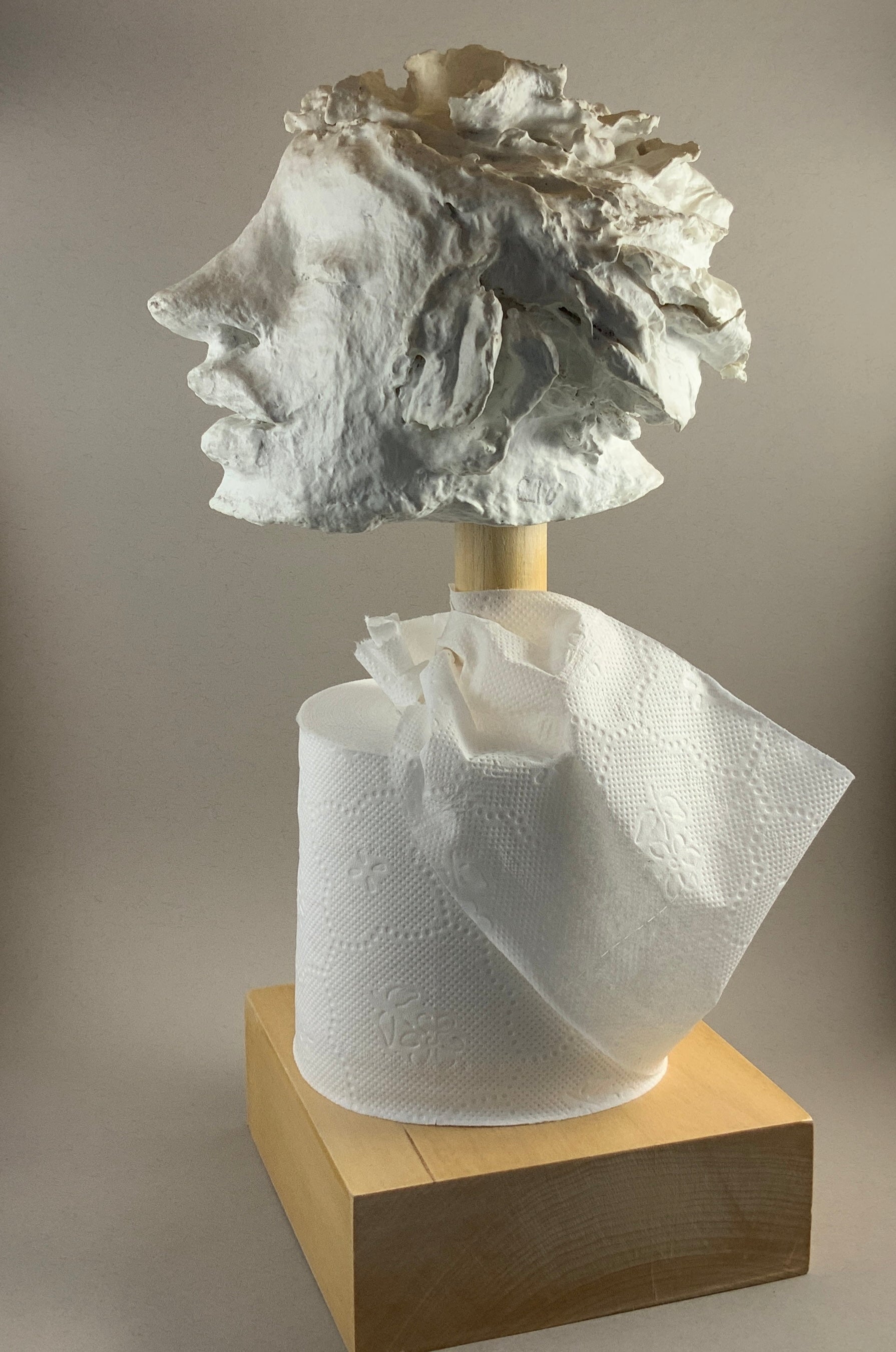Porte rouleau pour le papier hygiénique, pièce unique fabriqué à partir d’un rouleau de papier. Il a un côté féminin et un masculin. Sur un socle de bois pâle. Recouvert d’acrylique blanche, le vernis est antistatique.