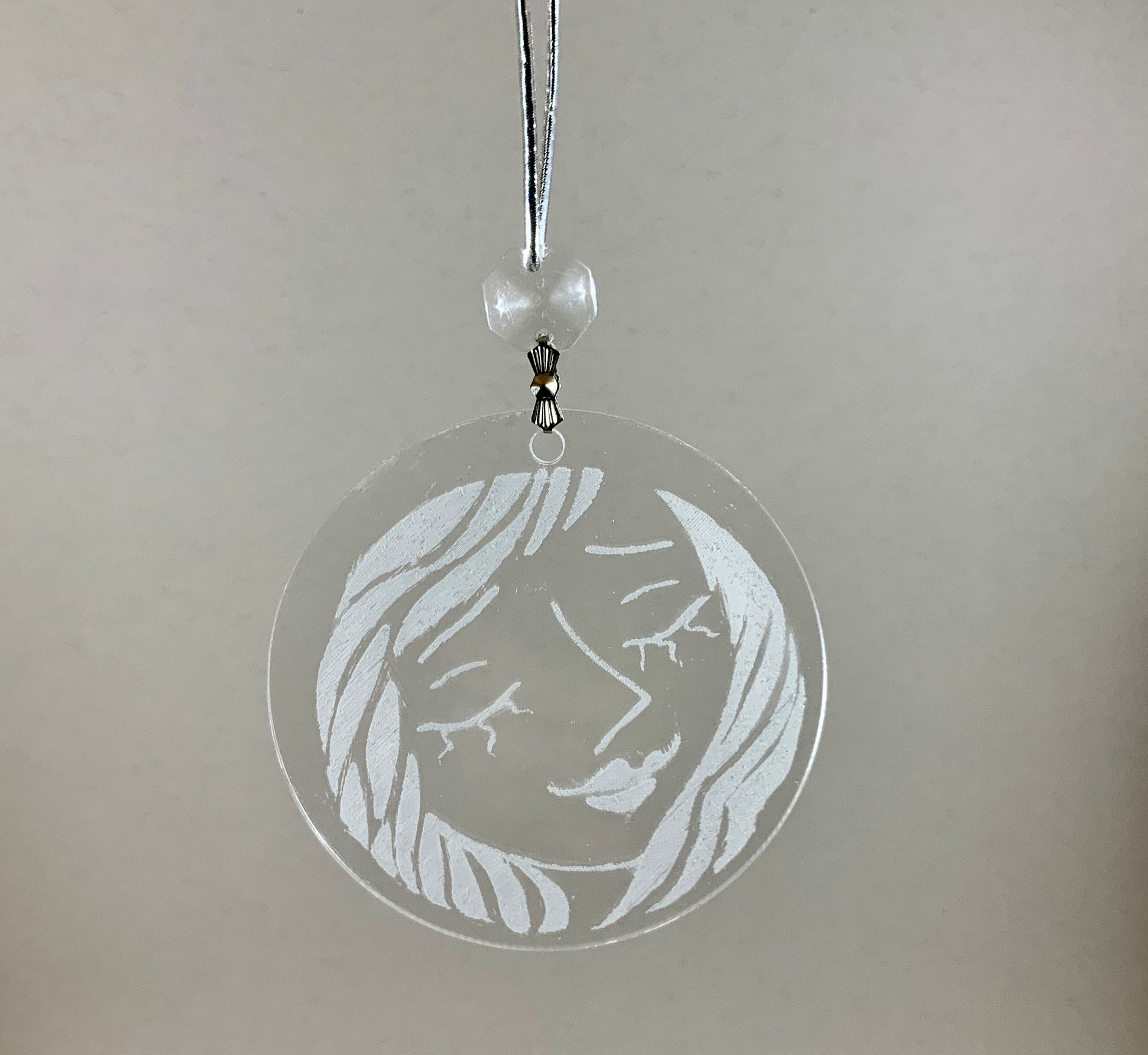 Image de Claudie Villeneuve gravée sur pastille d’acrylique.
