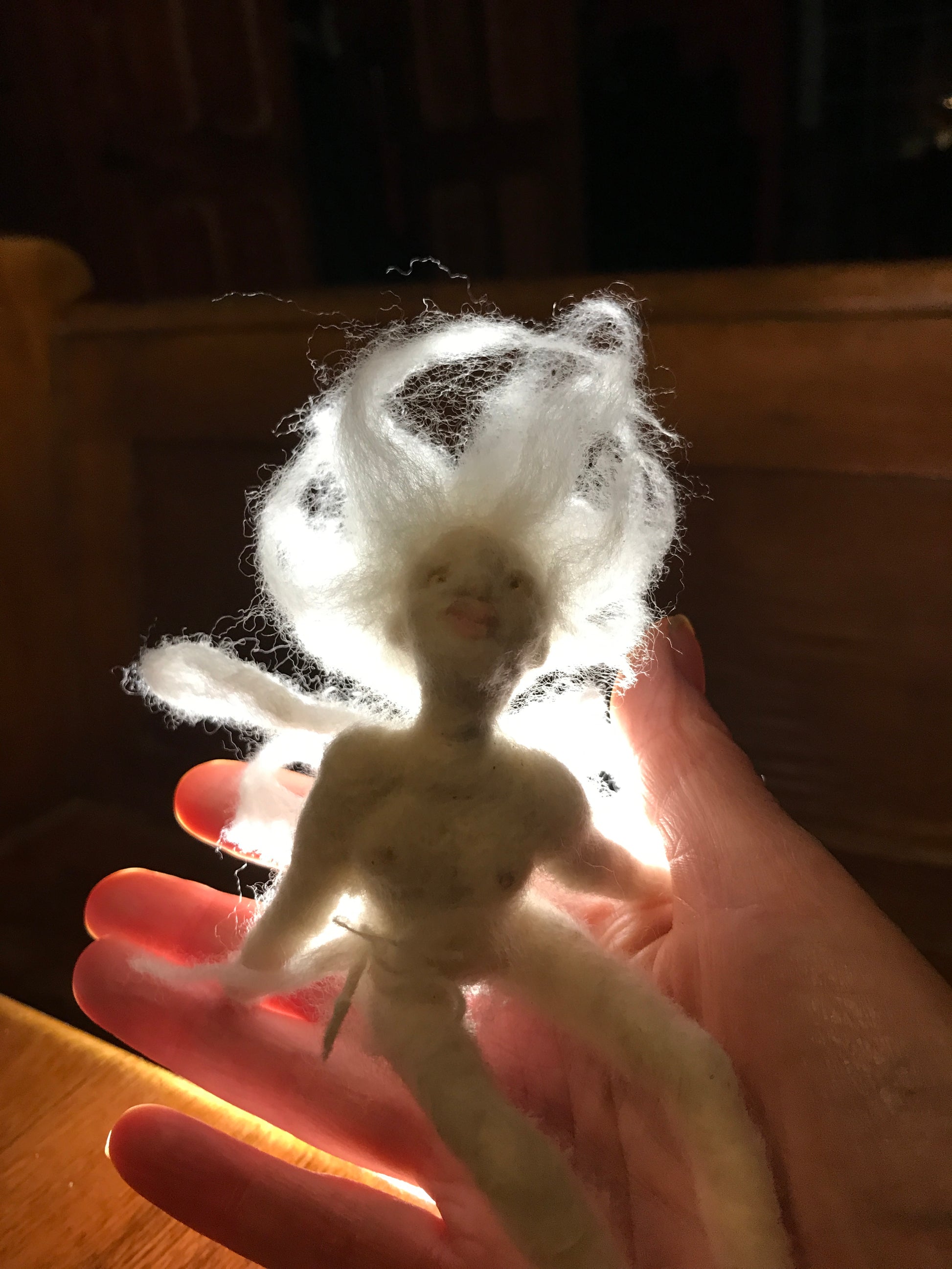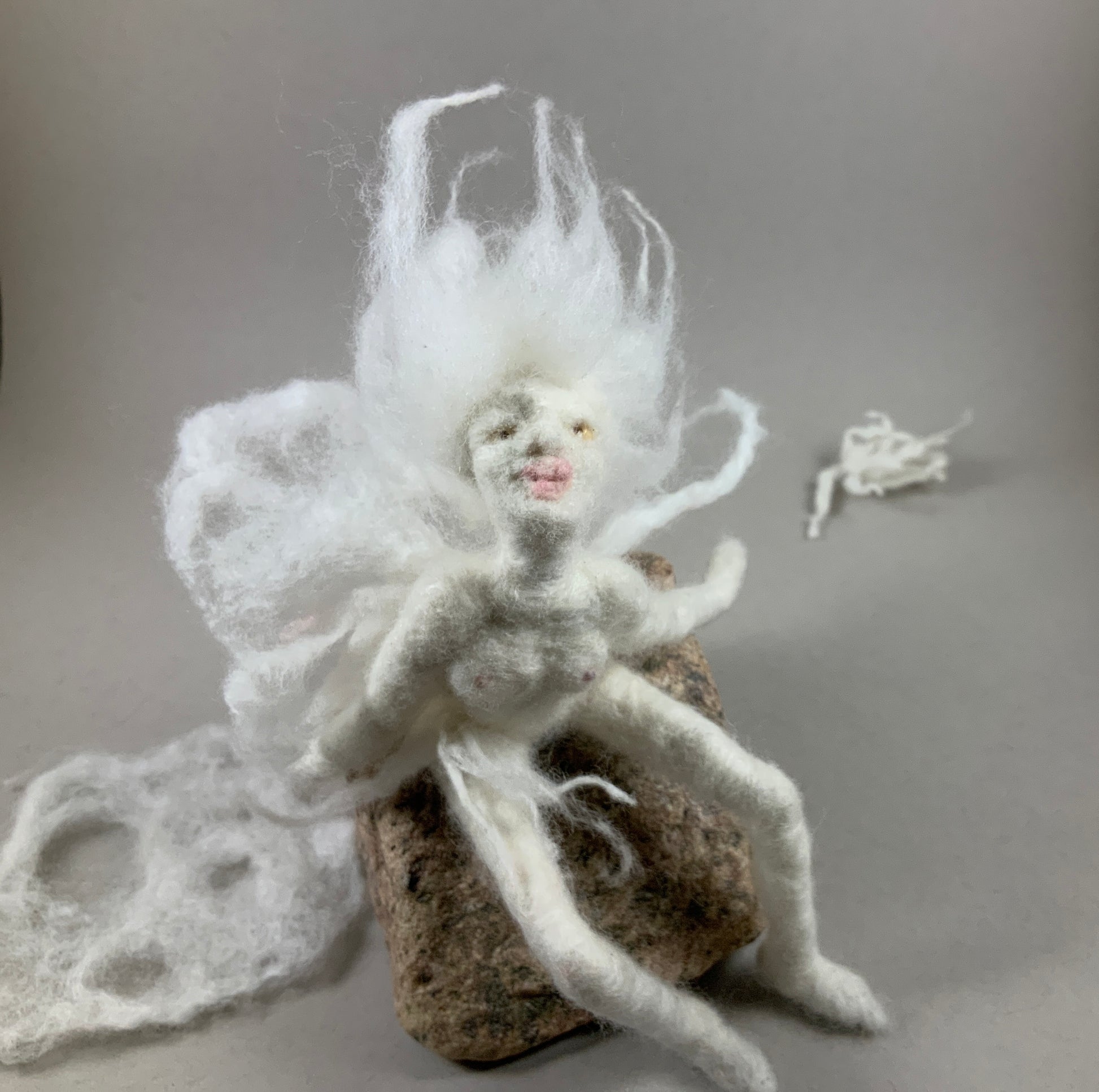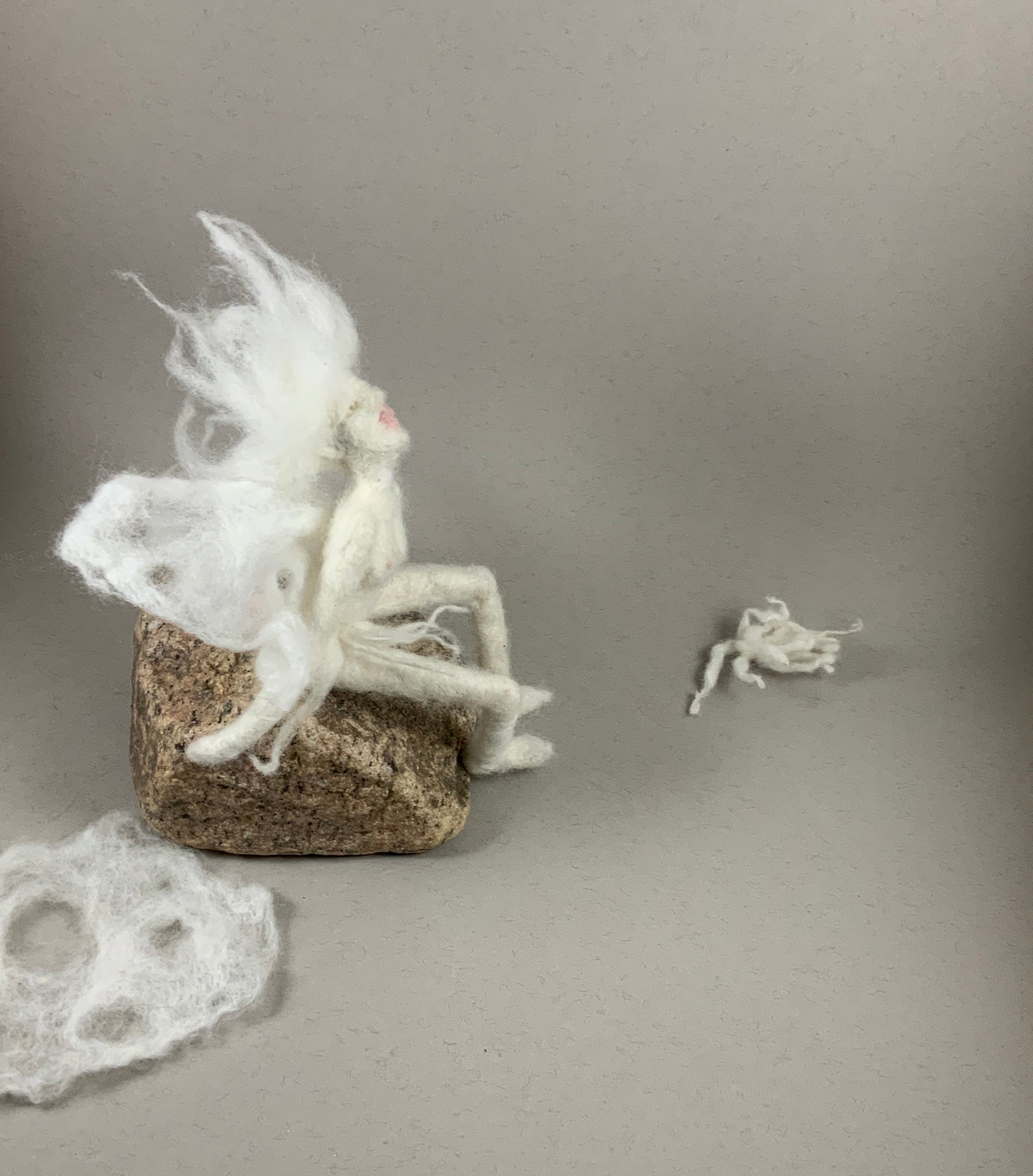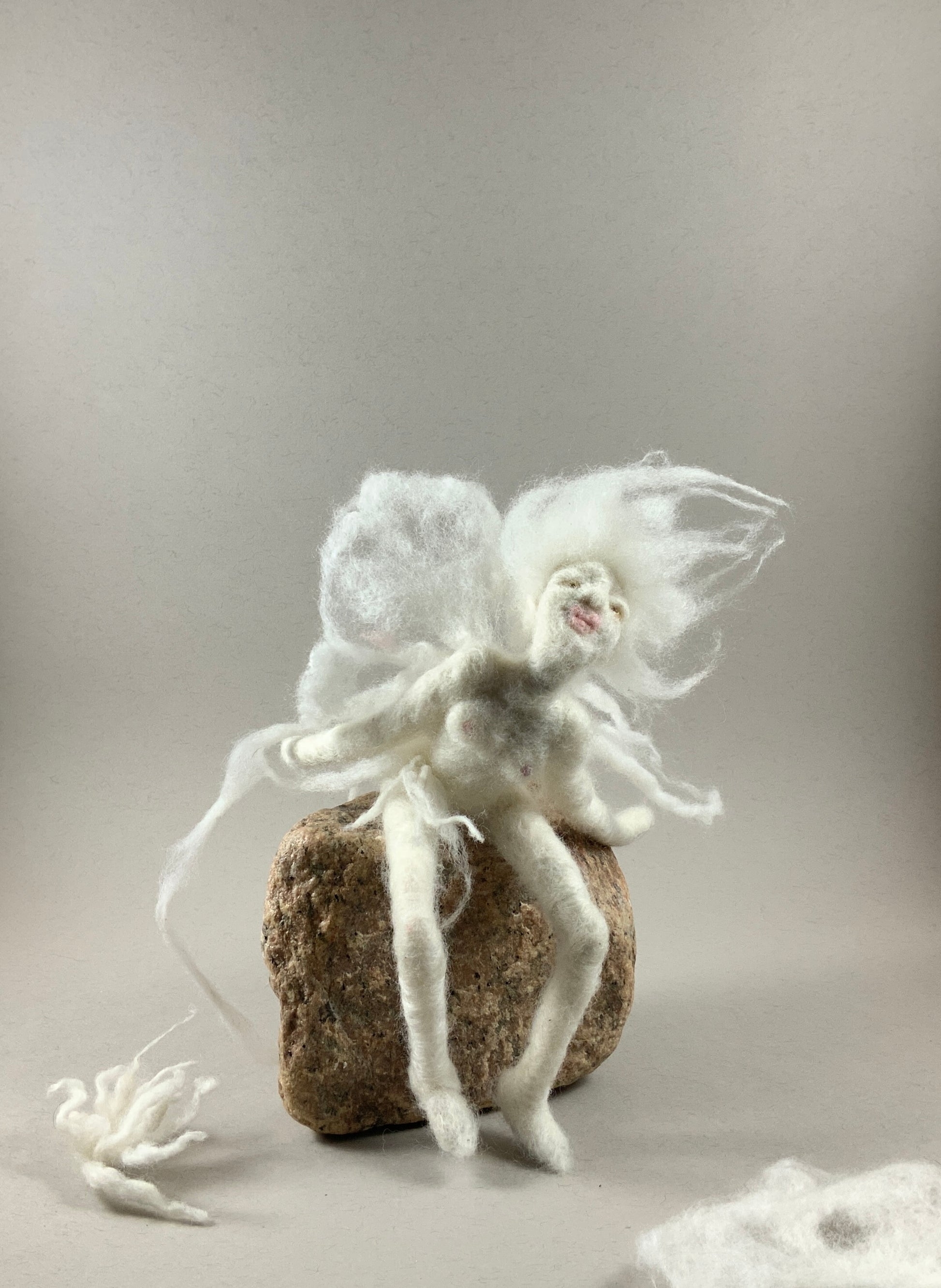 À Noël la fée feutrée est passée chez moi pour ensorceler mes doigts créatifs, ainsi est né un petit ange. J’adore la technique de feutrage à l’aiguille, la laine donne de la sensibilité au personnage, un aspect duveteux et réconfortant! Créée en 2023.
