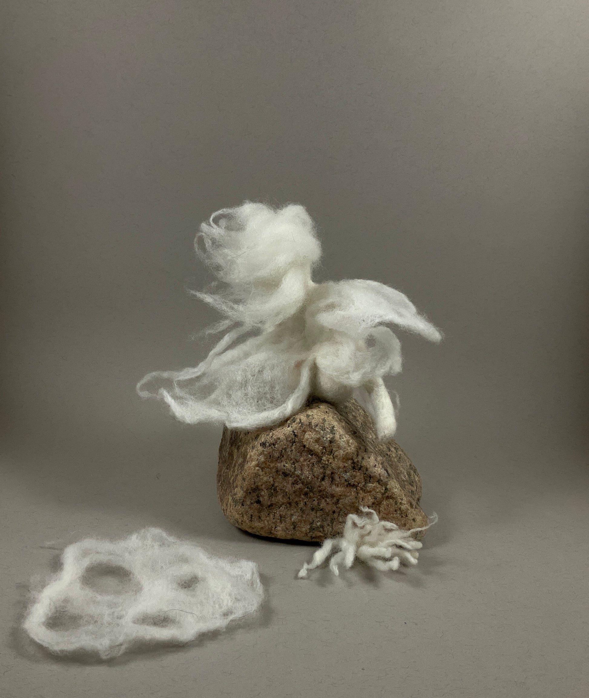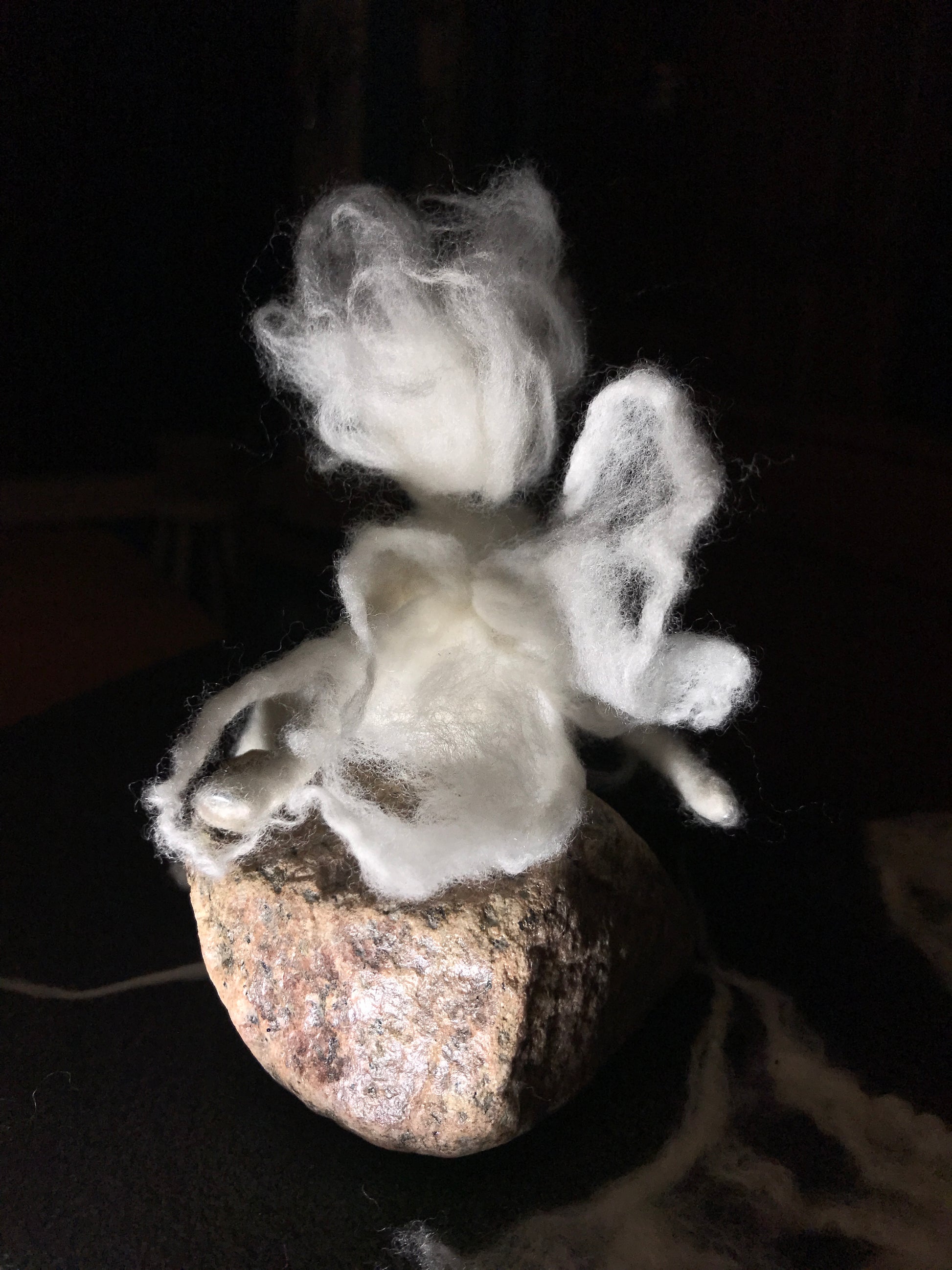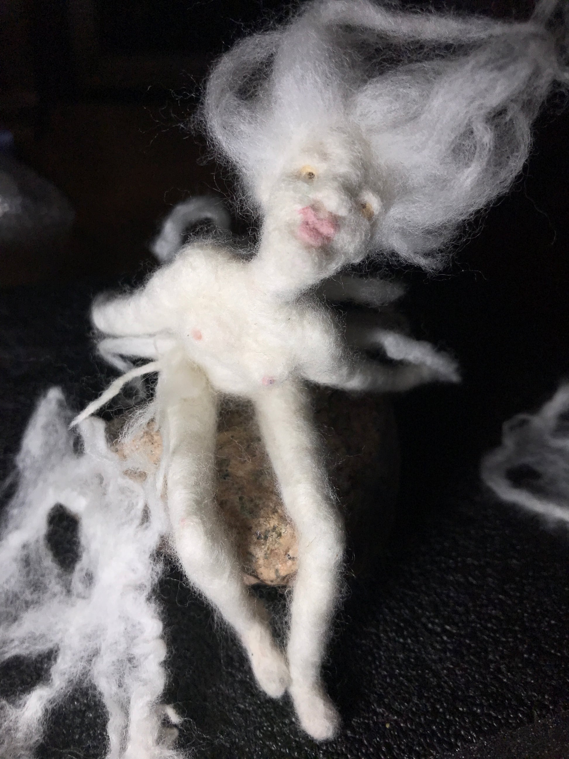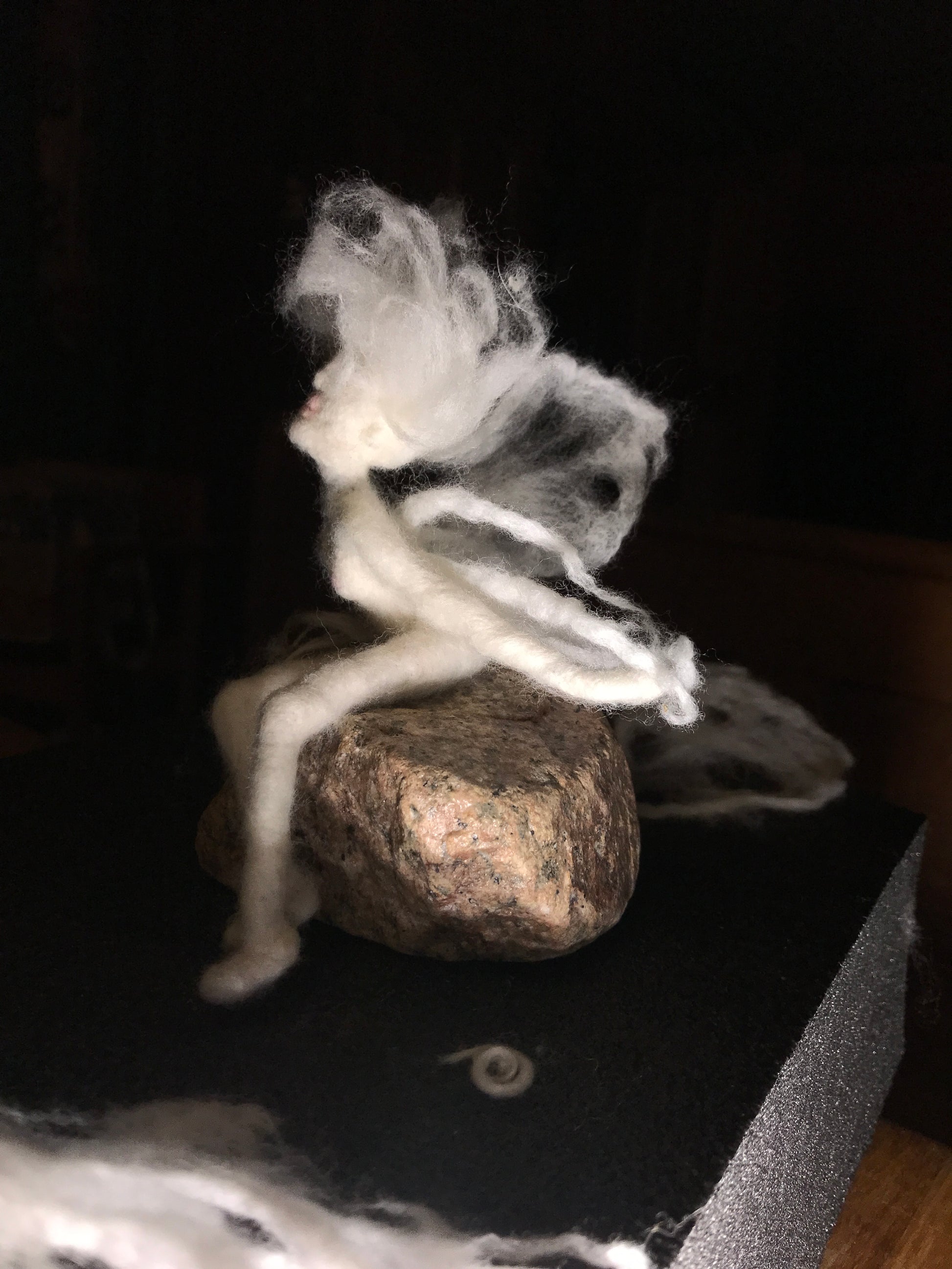 À Noël la fée feutrée est passée chez moi pour ensorceler mes doigts créatifs, ainsi est né un petit ange. J’adore la technique de feutrage à l’aiguille, la laine donne de la sensibilité au personnage, un aspect duveteux et réconfortant! Créée en 2023.